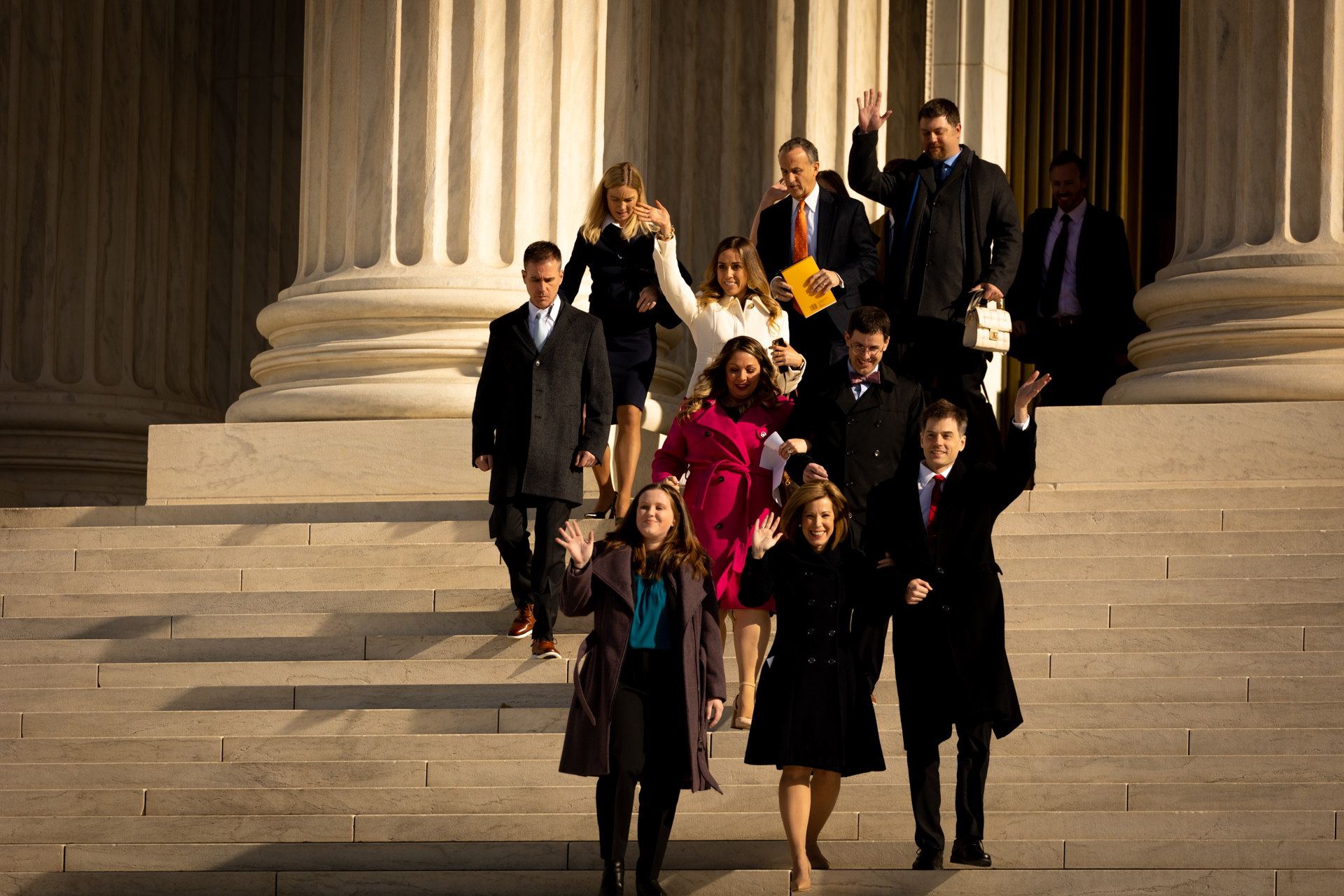 ADF CEO, President, and General Counsel Kristen Waggoner (front row center) accompanied by Director of the ADF Center for Conscience Initiatives Jonathan Scruggs (front row right) and ADF client Lorie Smith (second row left) accompanied by ADF Senior Vice President of Appellate Advocacy John Bursch (second row right) descend the steps of the U.S. Supreme Court in Washington, D.C., following oral arguments on Dec. 5, 2022.