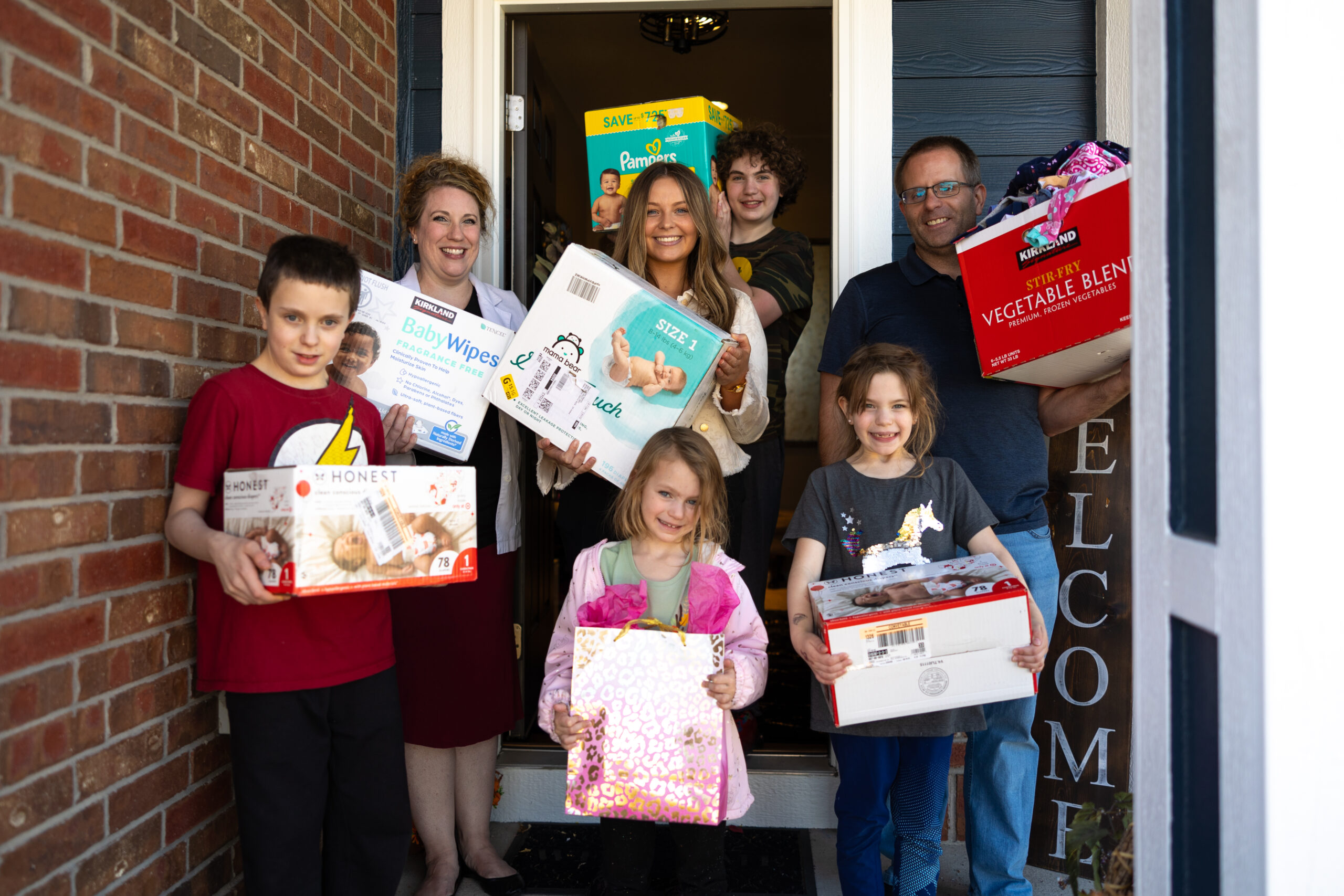 Mackenna (center), surrounded by Chelsea Mynyk, licensed nurse practitioner and certified nurse midwife (L), and her family, providing baby supplies to Mackenna.