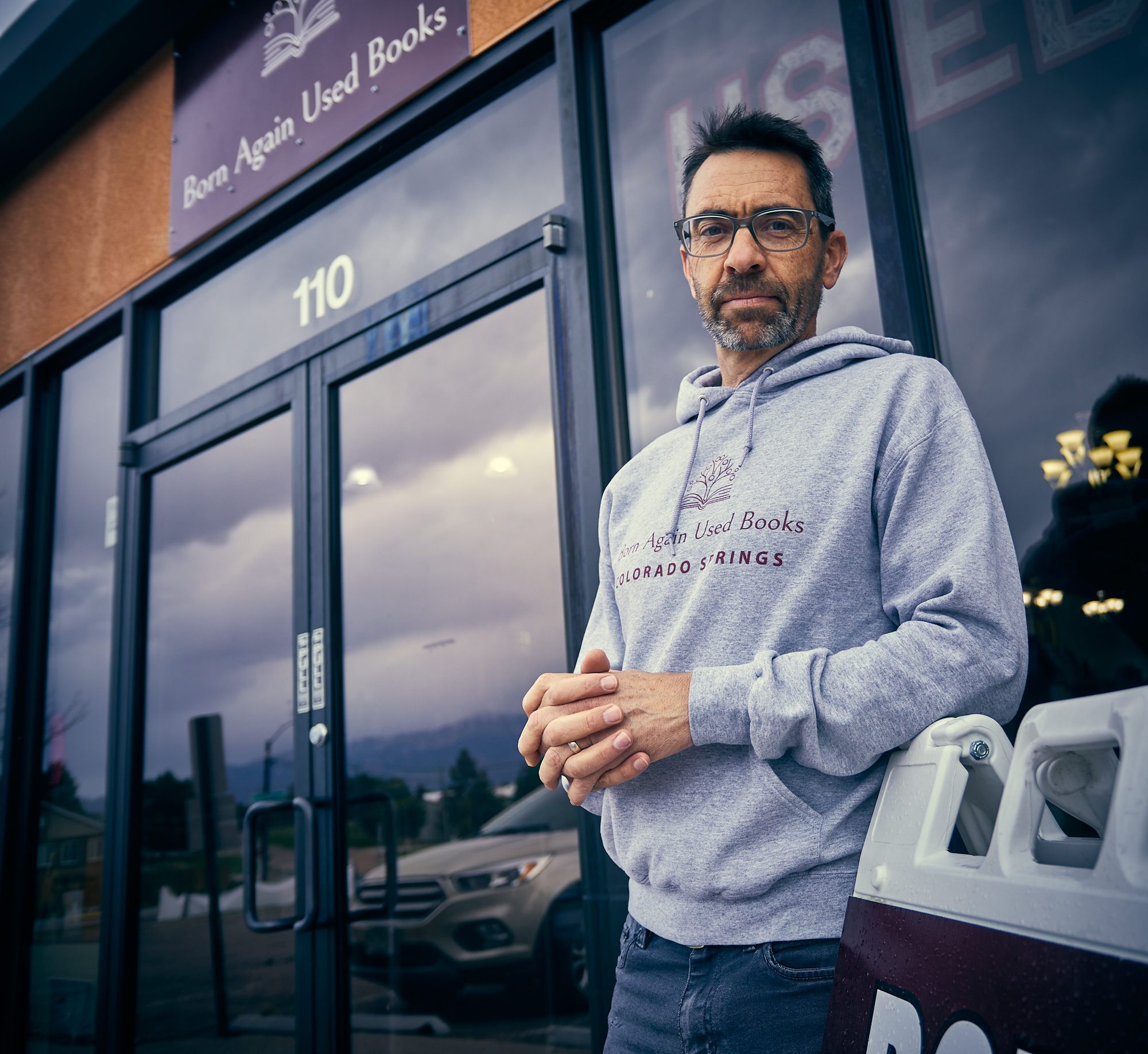 Eric Smith, owner of Born Again Used Books, outside the store in Colorado Springs, Colorado.