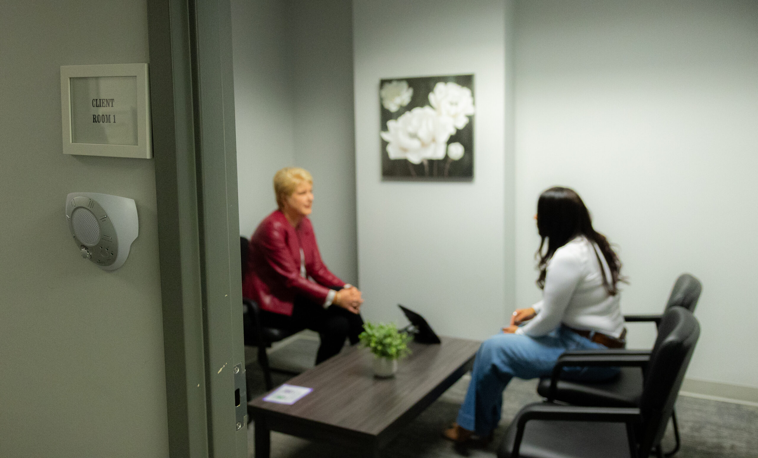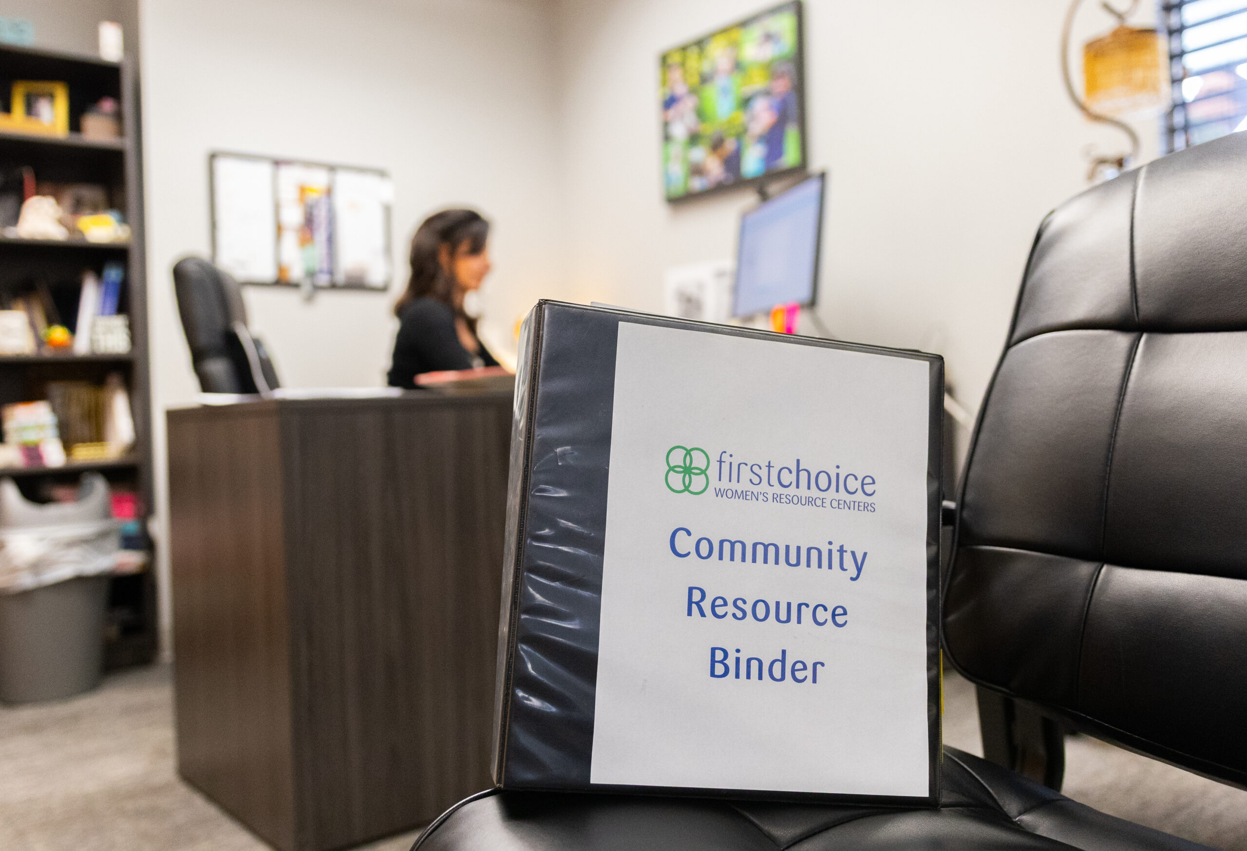 Aimee Huber (L), executive director of First Choice Women's Resource Centers in New Jersey, talking to a woman.